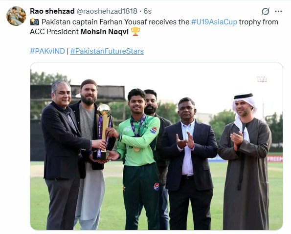 Victory lap with ACC and PCB chairman Mohsin Naqvi by Pakistan players after winning the #U19AsiaCup 2025.#PAKU19vINDU19 | #Cricket | #Pakistan | #MohsinNaqvi | #SarfarazAhmed | #India | #Dubai pic.twitter.com/0SzoRGQsws— Khel Shel (@khelshel) December 21, 2025