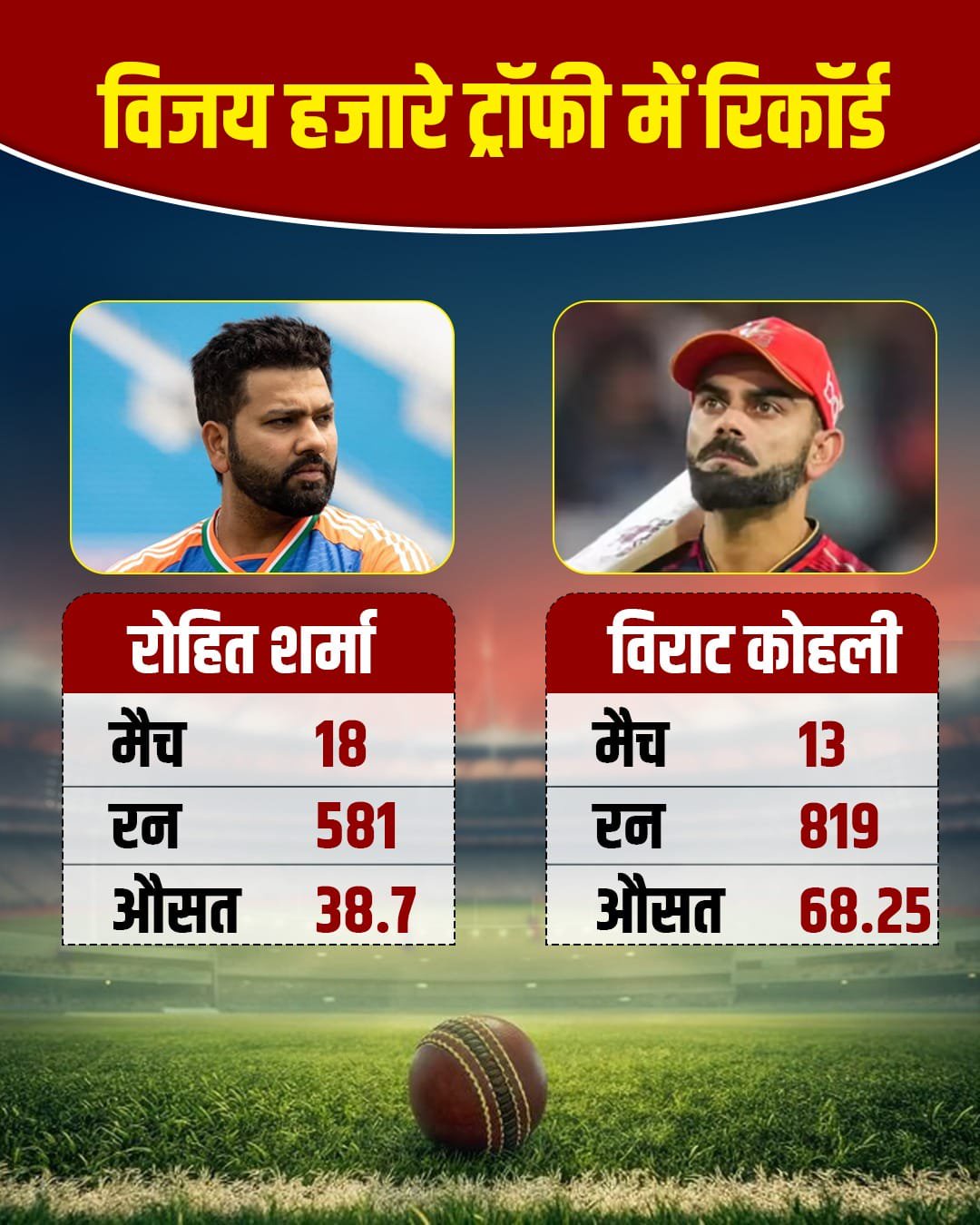 Vijay Hazare Trophy 2025-26: BCCI के घरेलू वनडे टूर्नामेंट विजय हजारे ट्रॉफी की शुरुआत 24 दिसंबर से होने जा रही है. इस टूर्नामेंट को लेकर इस बार ज्यादा चर्चा इसलिए हैं क्योंकि उसमें सालों बाद रोहित शर्मा और विराट कोहली खेलने वाले हैं. रोहित शर्मा 7 साल पहले इस टूर्नामेंट में आखिरी बार खेले थे. वहीं विराट कोहली तो 15 साल बाद इस टूर्नामेंट में वापसी करते दिखेंगे. लेकिन, हमारा सवाल ये नहीं कि विराट-रोहित आखिरी बार विजय हजारे ट्रॉफी में कब खेले थे बल्कि ये है कि उन्होंने इस टूर्नामेंट में कितने रन बनाए हैं? उन दोनों का रिकॉर्ड कैसा है?
