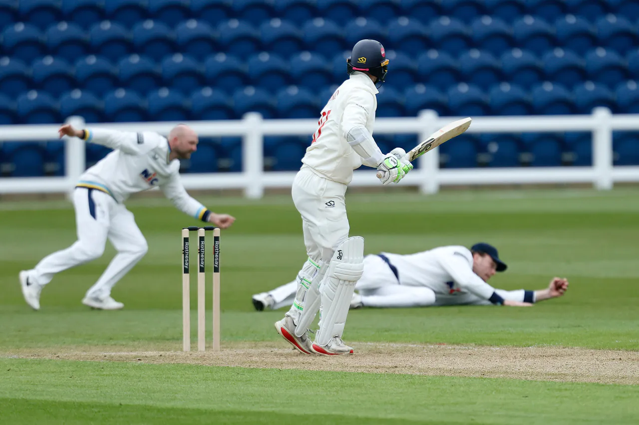 In the 12th, Sean Dickson edged a drive at the same bowler, with Bairstow taking a one-handed catch going low to his right in front of first slip – 21-3.