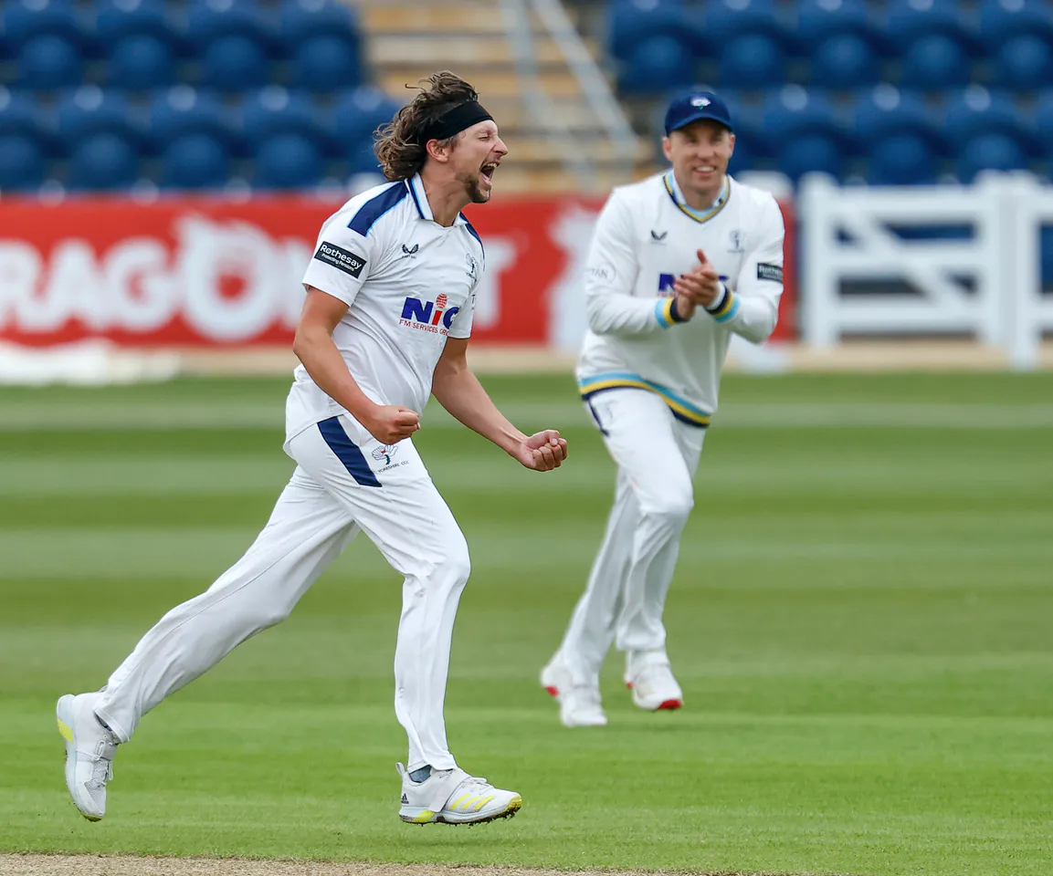 And at the end of the 14th over, White had three-for as new Glamorgan captain Kiran Carlson tried to whip a delivery over Bess, stationed at a wide leg-slip. Thankfully, from a Yorkshire point of view, he couldn’t. And the White Rose were flying with the score at 28-4.