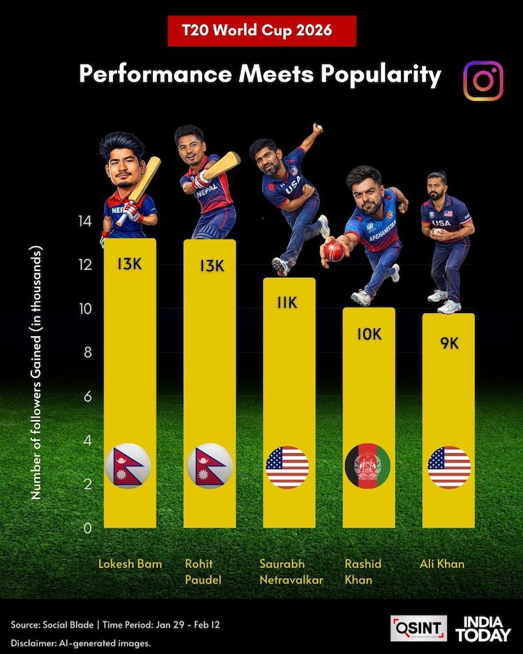 Data fetched by India Today shows a clear surge in Instagram followers for players from Afghanistan, Nepal, and the USA. What happened on a 22-yard pitch translated almost instantly to fingertips.