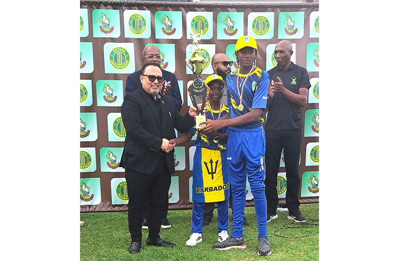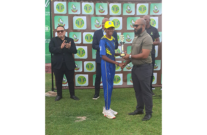 The pint-size 12-year-old left-handed Daniel Johnson looked the most technically correct batter in the local side, he hit a single boundary in his 26 from 72 balls to be the glue that held the innings together before he fell. Skipper ZDari Scantlebury after Khan, Guyana’s most aggressive batter, was caught and bowled for 12 with a couple of boundaries by left arm spinner Liam Sookram.