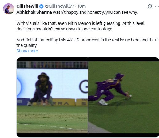 The left-hander's blistering knock came to an abrupt end when he was adjudged caught at deep square leg off Blessing Muzarabani, just two runs short of a half-century. Attempting to take on a short delivery, Abhishek pulled hard towards the leg side, where Varun Chakaravarthy sprinted to his right and completed a low catch inches above the turf. While KKR players celebrated immediately, Abhishek stood his ground, unconvinced about the cleanliness of the take, prompting the on-field umpires to go upstairs.
