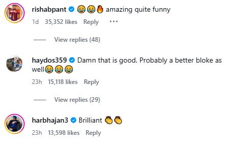 Not only did social media users enjoy the video, but several cricketers did too. Rishabh Pant commented, “Amazing, quite funny.” Former Australia opener Matthew Hayden wrote, “Damn that is good. Probably a better bloke as well.” Harbhajan Singh simply summed it up: “Brilliant.”